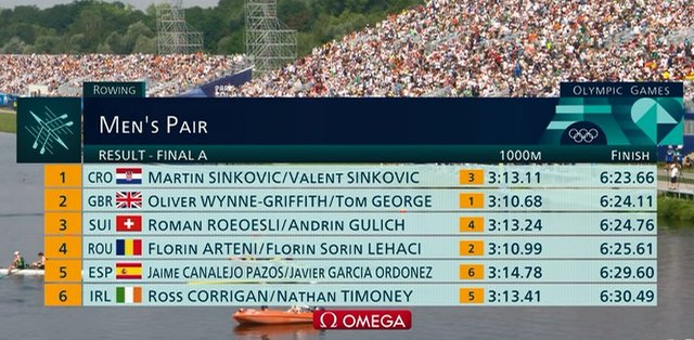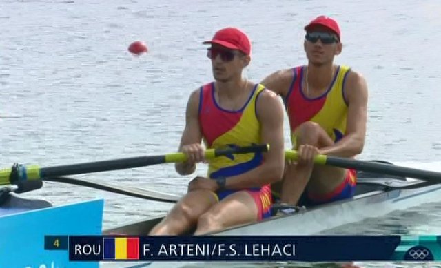 UPDATE 12:36 Incredibil final de cursă. Croația a venit puternic din spate și a luat aurul prin frații Sinkovic, devansând Marea Britanie, care a condus trei sferturi din cursă. România ratează din păcate podiumul, terminând cursa pe locul patru. Lehaci și Arteni au fost pe locul 2 trei sferturi din cursă, dar au pierdut teren pe ultimii 500 de metri.