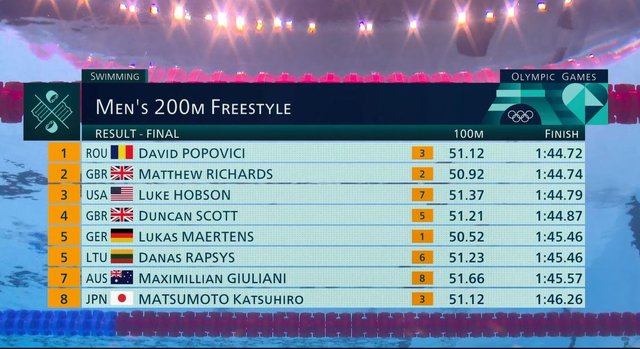 Însă, pe ultimii 50 de metri s-a întâmplat miracolul. Aflat cu trei palme în urma liderului german care a terminat pe locul 5, Popovici a recuperat centimetru cu centimetru și a terminat pe locul 1 cu doar două sutimi avans față de britanicul Matthew Richards, venit și el puternic din spate, alături de americanul clasat al treilea, Luke Hobson.